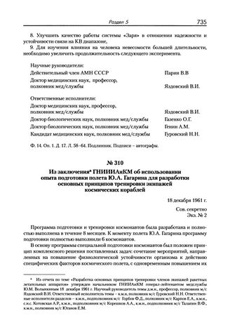 Из заключения ГНИИИАиКМ об использовании опыта подготовки полета Ю.А. Гагарина для разработки основных принципов тренировки экипажей космических кораблей. 18 декабря 1961 г.