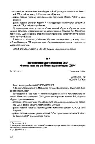 Постановление Совета Министров СССР «О новом полигоне для Министерства обороны СССР». № 292-181сс. 12 февраля 1955 г. // АП РФ. Ф. 93. Коллекция постановлений и распоряжений СМ СССР за 1955 г. Заверенная копия на бланке.