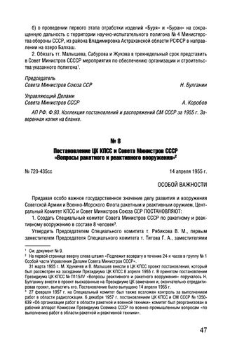 Постановление ЦК КПСС и Совета Министров СССР «Вопросы ракетного и реактивного вооружения». № 720-435сс. 14 апреля 1955 г. // АП РФ. Ф. 93. Коллекция постановлений и распоряжений СМ СССР за 1955 г. Заверенная копия на бланке.