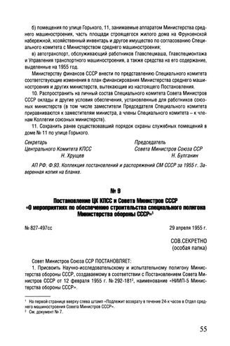 Постановление ЦК КПСС и Совета Министров СССР «О мероприятиях по обеспечению строительства специального полигона Министерства обороны СССР». № 827-497сс. 29 апреля 1955 г.