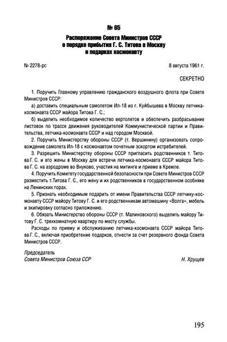 Распоряжение Совета Министров СССР о порядке прибытия Г.С. Титова в Москву и подарках космонавту. № 2278-рс. 8 августа 1961 г. // АП РФ. Ф. 93. Коллекция постановлений и распоряжений СМ СССР за 1961 г. Заверенная копия на бланке.