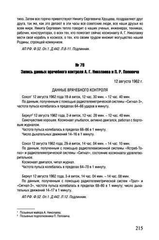 Запись данных врачебного контроля А.Г. Николаева и П.Р. Поповича. 12 августа 1962 г.