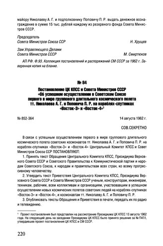 Постановление ЦК КПСС и Совета Министров СССР «Об успешном осуществлении в Советском Союзе первого в мире группового длительного космического полета тт. Николаева А.Г. и Поповича П.Р. на кораблях-спутниках «Восток-3» и «Восток-4». № 852-364. 14 августа 1962 г.