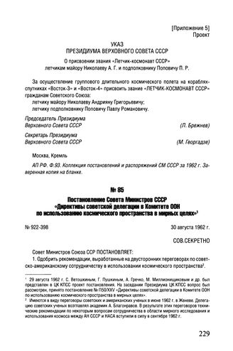 Постановление Совета Министров СССР «Директивы советской делегации в Комитете ООН по использованию космического пространства в мирных целях». № 922-398. 30 августа 1962 г. // АП РФ. Ф. 93. Коллекция постановлений и распоряжений СМ СССР за 1962 г. Заверенная копия на бланке.