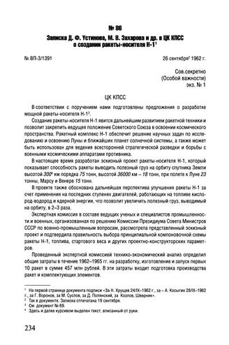 Записка Д.Ф. Устинова, М.В. Захарова и др. в ЦК КПСС о создании ракеты-носителя Н-1. № ВП-3/1391. 26 сентября 1962 г.