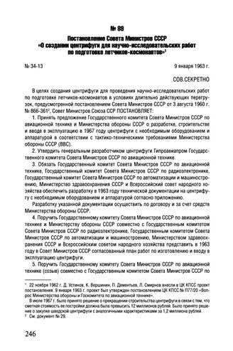 Постановление Совета Министров СССР «О создании центрифуги для научно-исследовательских работ по подготовке летчиков-космонавтов». № 34-13. 9 января 1963 г.