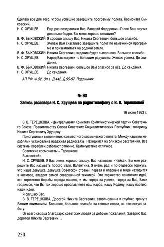 Запись разговора Н.С. Хрущева по радиотелефону с В.В. Терешковой. 16 июня 1963 г. // АП РФ. Ф. 52. Оп. 1. Д. 442. Д. 107-109. Неправленная стенограмма.