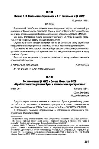 Постановление ЦК КПСС и Совета Министров СССР «О работах по исследованию Луны и космического пространства». № 655-268. 3 августа 1964 г. // АП РФ. Ф. 93. Коллекция постановлений и распоряжений СМ СССР за 1964 г. Заверенная копия на бланке.