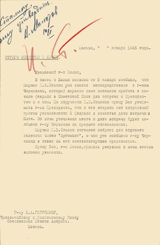 Письмо наркома иностранных дел СССР В.М. Молотова послу США в СССР А. Гарриману о согласии И.В. Сталина с выбором кодового слова «Аргонавт» для предстоящей встречи лидеров трех союзных держав – СССР, США и Великобритании. 10 января 1945 г. // АВП РФ, ф. 06, оп. 7а, п. 57, д. 2, л. 39.