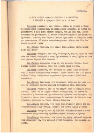 Запись беседы И.В. Сталина с Ф. Рузвельтом. 4 февраля 1945 г. // АВП РФ, ф. 06, оп. 7а, п. 58, д. 7, л. 15-19.