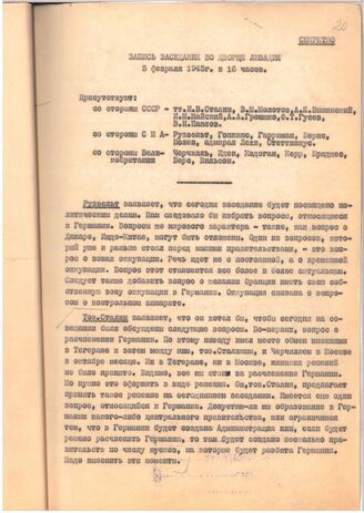 Запись заседания глав правительств. [См. лл. 1-2, 5 – начало дискуссии о будущем Германии (включая проблему безоговорочной капитуляции, расчленения Германии, взимания репараций), лл. 16-18 – доклад И.М. Майского по плану взимания репараций, разработанному советской стороной, лл. 24-25 – завершение дискуссии по вопросу о репарациях]. 5 февраля 1945 г. // АВП РФ, ф. 06, оп. 7а, п. 58, д. 7, л. 20-44.