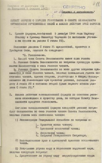 Главная Рассекреченные документы по Крымской конференции 4-11 февраля 1945 ... Документы Проект формулы о порядке голосования в Совете Безопасности ООН, пре...