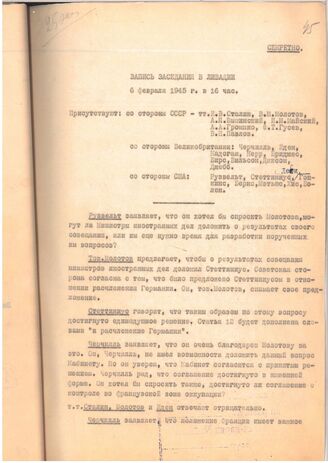 Запись заседания глав правительств. [См. лл. 1-3 – подтверждение решения о расчленении Германии; начало дискуссии о всемирной организации, лл. 8-9 – общие соображения И.В. Сталина о целях всемирной организации, лл. 17-20 – дискуссия по польскому вопросу, включая вопрос о границах Польши, о правительстве Польши, об обеспечении безопасности тыла Красной армии на территории Польши]. 6 февраля 1945 г. // АВП РФ, ф. 06, оп. 7а, п. 58, д. 7, л. 45-64.