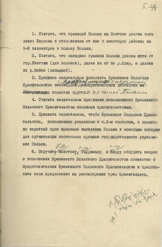 Советские предложения по вопросу о будущем Польши (вручено В.М. Молотовым Э. Стеттиниусу 7 февраля). [7] февраля 1945 г. // АВП РФ, ф. 06, оп. 7а, п. 59, д. 26, л. 5.