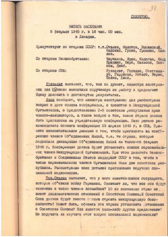 Запись заседания глав правительств. [См. лл. 1-6 – рассмотрение доклада министров иностранных дел по вопросам всемирной организации, обсуждение вопроса о включении Украины и Белоруссии в число первоначальных членов всемирной организации]. 8 февраля 1945 г. // АВП РФ, ф. 06, оп. 7а, п. 58, д. 7, л. 90-105.