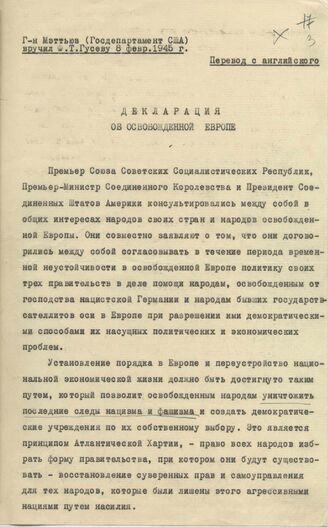 Проект Декларации об освобожденной Европы (предложения американской делегации, правка по тексту графитным карандашом – автограф В.М. Молотова). [Рассмотрено на заседании глав трех правительств 9 февраля, принято с поправками на заседании 10 февраля]. 8 февраля 1945 г. // АВП РФ, ф. 06, оп. 7а, п. 64, д. 5, л. 3-5.