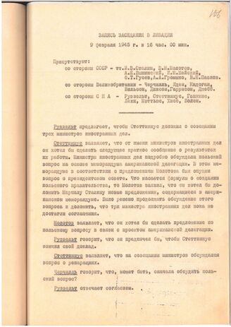 Запись заседания глав правительств. [См. л. 1 – начало дискуссии по польскому вопросу, лл. 9-10 – прения по вопросу о будущих польских выборах, лл. 13-14 – обсуждение проблемы наказания военных преступников]. 9 февраля 1945 г.