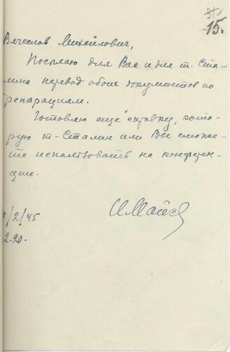 Британские проекты документов «Основные принципов взимания репараций с Германии» и «Относительно организации союзного репарационного комитета» (перевод на русский язык с сопроводительной запиской И.М. Майского В.М. Молотову). 10 февраля 1945 г.