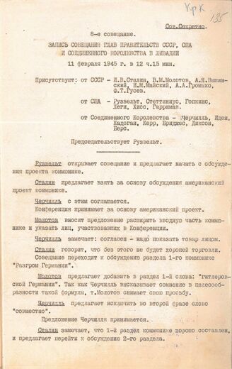 Запись итогового заседания глав правительств. 11 февраля 1945 г. // АВП РФ, ф. 06, оп. 7а, п. 58, д. 7, л. 135-139.