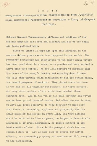Текст выступления премьер-министра Великобритании У. Черчилля на аэродроме перед отлетом из Крыма (на английском и русском языках). 14 февраля 1945 г. // АВП РФ, ф. 06, оп. 7а, п. 58, д. 10, л. 20, 21, 24-25.