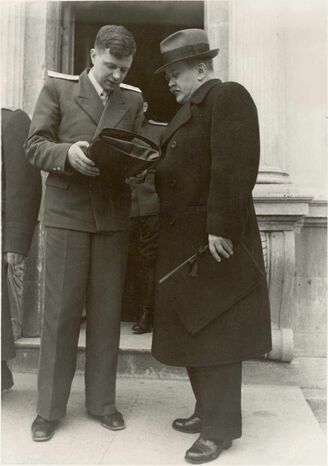В.М. Молотов со своим помощником Б.Ф. Подцеробом во время конференц...