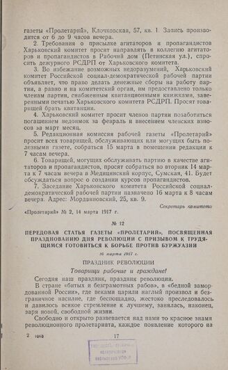 Передовая статья газеты «Пролетарий», посвященная празднованию дня революции с призывом к трудящимся готовиться к борьбе против буржуазии. 16 марта 1917 г. // «Пролетарий», № 3, 16 марта 1917 г.