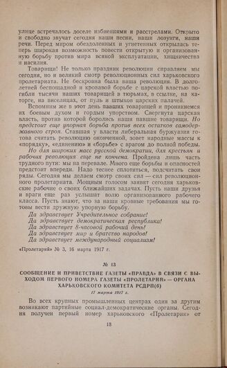 Сообщение и приветствие газеты «Правда» в связи с выходом первого номера газеты «Пролетарий» — органа Харьковского комитета РСДРП(б). 17 марта 1917 г.