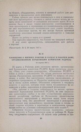 Сообщение о митинге рабочих и солдат в Рабочем доме, организованном Харьковским комитетом РСДРП(б). 25 марта 1917 г. // «Пролетарий», № 8, 28 марта 1917 г.