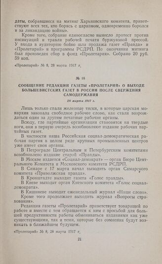 Сообщение редакции газеты «Пролетарий» о выходе большевистских газет в России после свержения самодержавия. 28 марта 1917 г. // «Пролетарий», № 8, 28 марта 1917 г.