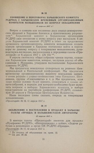 Сообщение о переговорах Харьковского комитета РСДРП(б) с Харьковским Временным организационным комитетом меньшевиков по вопросу объединения. 11 апреля 1917 г. // «Пролетарий», № 16, 11 апреля 1917 г.