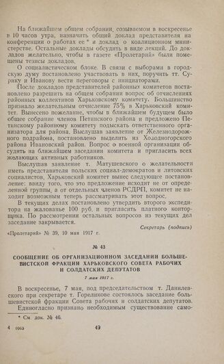 Сообщение об организационном заседании большевистской фракции Харьковского Совета рабочих и солдатских депутатов. 7 мая 1917 г. // «Пролетарий», № 38, 9 мая 1917 г.