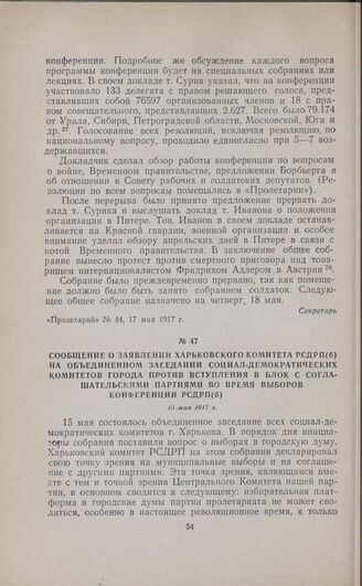 Сообщение о заявлении Харьковского комитета РСДРП(б). на объединенном заседании социал-демократических комитетов города против вступления в блок с соглашательскими партиями во время выборов конференции РСДРП(б). 15 мая 1917 г. // «Пролетарий, № 44, 17 мая 1917 г.