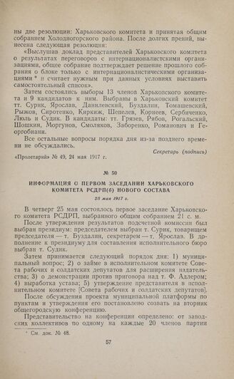 Информация о первом заседании Харьковского комитета РСДРП(б) нового состава. 25 мая 1917 г. // «Пролетарий», № 52, 27 мая 1917 г.