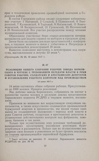 Резолюция общего собрания рабочих завода Борковского в Чугуеве с требованием передачи власти в руки Советов рабочих, солдатских и крестьянских депутатов и установления рабочего контроля над производством. 14 июня 1917 г. // «Пролетарий», № 69, 16 июня 1917 г.