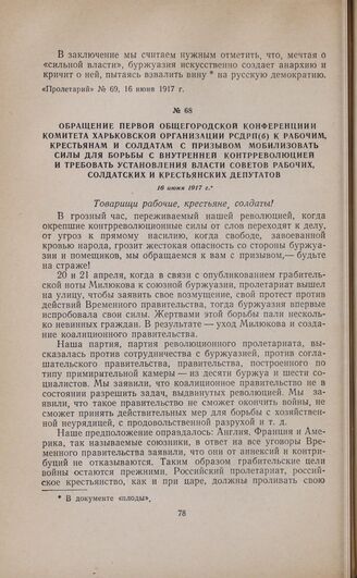 Обращение Первой общегородской конференции комитета Харьковской организации РСДРП(б) к рабочим, крестьянам и солдатам с призывом мобилизовать силы для борьбы с внутренней контрреволюцией и требовать установления власти Советов рабочих, солдатских ...