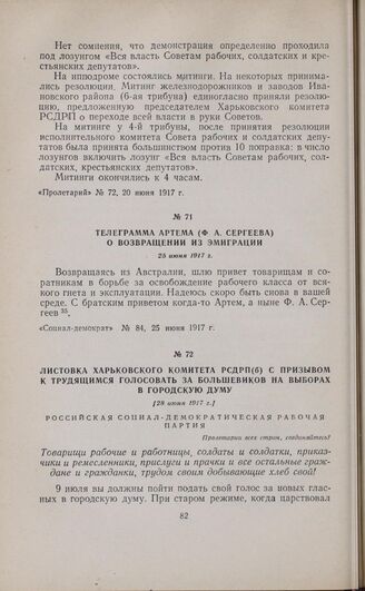 Телеграмма Артема (Ф.А. Сергеева) о возвращении из эмиграции. 26 июня 1917 г. // «Социал-демократ», № 84, 25 июня 1917 г.