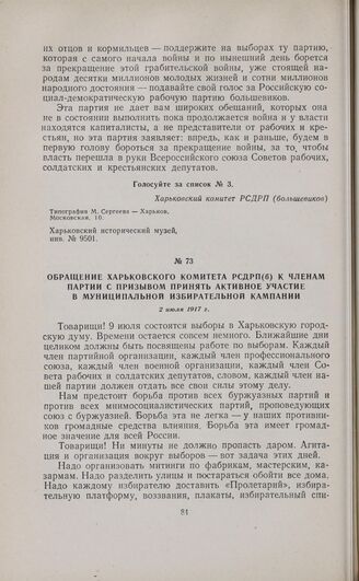 Обращение Харьковского комитета РСДРП(б) к членам партии с призывом принять активное участие в муниципальной избирательной кампании. 2 июля 1917 г. // «Пролетарий», № 81, 2 июля 1917 г.