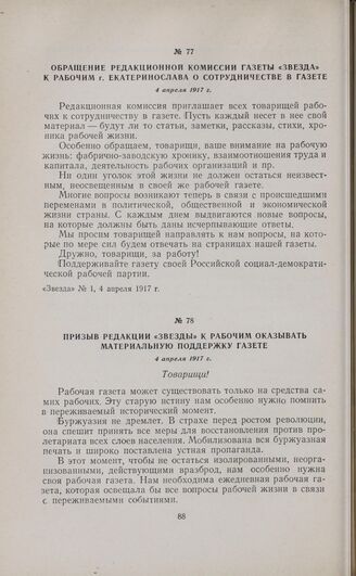 Призыв редакции «Звезды» к рабочим оказывать материальную поддержку газете. 4 апреля 1917 г. // «Звезда», № 1, 4 апреля 1917 г.