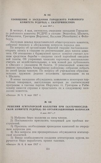 Решения агитаторской коллегии при Екатеринославском комитете РСДРП(б) по организационным вопросам. 6 мая 1917 г. // «Звезда», № 8, 6 мая 1917 г.