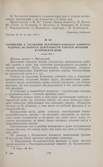 Сообщение о заседании Екатеринославского комитета РСДРП(б) по вопросу деятельности рабочей фракции в городской думе. 6 мая 1917 г. // «Звезда», № 9, 9 мая 1917 г.