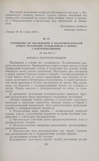 Сообщение об обсуждении в Екатеринославском Совете резолюции большевиков о борьбе с контрреволюцией. [25 мая 1917 г.] // «Звезда», № 15, 30 мая 1917 г.