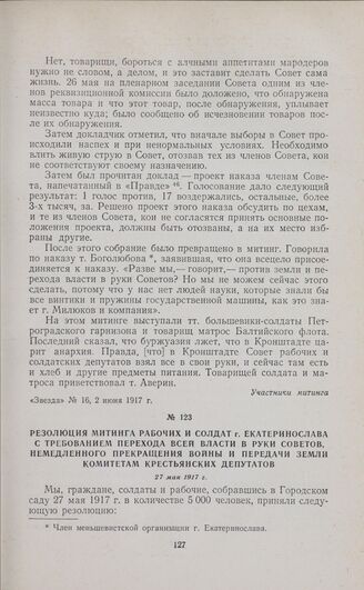 Резолюция митинга рабочих и солдат г. Екатеринослава с требованием перехода всей власти в руки Советов, немедленного прекращения войны и передачи земли комитетам крестьянских депутатов. 27 мая 1917 г. // «Звезда», № 17, 6 июня 1917 г.