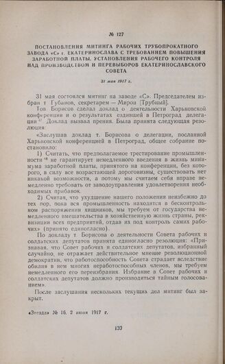 Постановления митинга рабочих трубопрокатного завода «С» г. Екатеринослава с требованием повышения заработной платы, установления рабочего контроля над производством и перевыборов Екатеринославского Совета. 31 мая 1917 г. // «Звезда», № 16, 2 июня 1917 г.