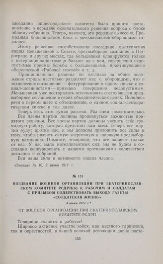 Воззвание военной организации при Екатеринославском комитете РСДРП(б) к рабочим и солдатам с призывом содействовать выходу газеты «Солдатская жизнь». 4 июня 1917 г. // «Солдатская жизнь», № 1, 4 июня 1917 г.