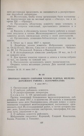 Протокол общего собрания членов РСДРП(б) Железнодорожного района г. Екатеринослава. 9 июня 1917 г. // «Звезда», № 20, 16 июня 1917 г.