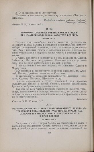 Резолюция Совета старост трубопрокатного завода «С», требующая установления рабочего контроля над банками и синдикатами и передачи власти в руки Советов. 10 июня 1917 г.