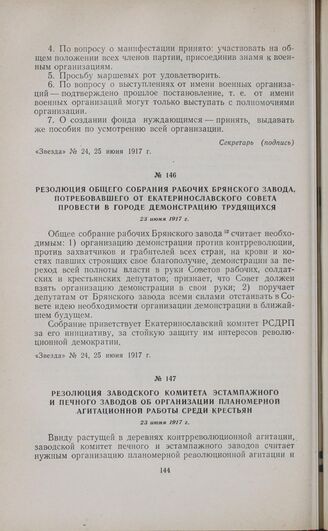 Резолюция общего собрания рабочих Брянского завода, потребовавшего от Екатеринославского Совета провести в городе демонстрацию трудящихся. 23 июня 1917 г. // «Звезда», № 24, 25 июня 1917 г.
