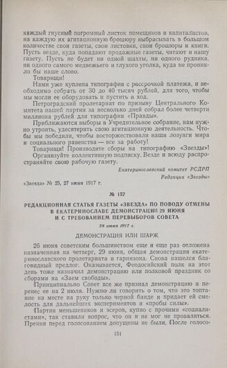 Редакционная статья газеты «Звезда» по поводу отмены в Екатеринославе демонстрации 29 июня и с требованием перевыборов Совета. 28 июня 1917 г. // «Звезда», № 26, 28 июня 1917 г.