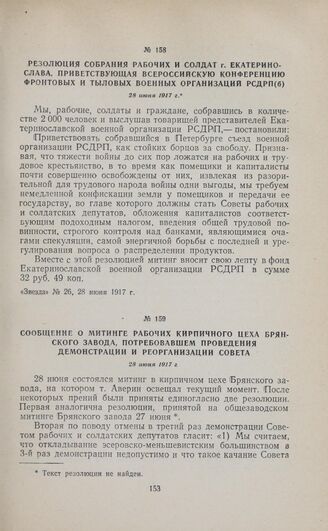 Сообщение о митинге рабочих кирпичного цеха Брянского завода, потребовавшем проведения демонстрации и реорганизации Совета. 28 июня 1917 г. // «Звезда», № 28, 1 июля 1917 г.
