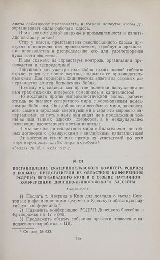 Постановление Екатеринославского комитета РСДРП(б) о посылке представителя на областную конференцию РСДРП(б) Юго-Западного края и о созыве партийной конференции Донецко-Криворожского бассейна. 1 июля 1917 г. // «Звезда», № 33, 7 июля 1917 г.